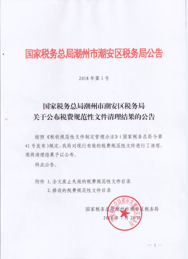 国家税务总局潮州市潮安区税务局关于公布税费规范性文件清理结果目录的公告