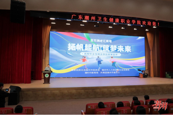 日前,潮州市税务局、市人力资源和社会保障局、市教育局、团市委等多部门依托“扬帆起航”税惠服务工作室,走进广东潮州卫生健康职业学院,举办一场以“百万英才汇南粤——扬帆起航 筑梦未来”为主题的高校毕业生就业创业政策宣讲活动,通过政策解读、互动问答、现场咨询等形式,为在校大学生精准推送就业创业扶持“政策礼包”,助力高校学生迈好职业生涯“第一步”。