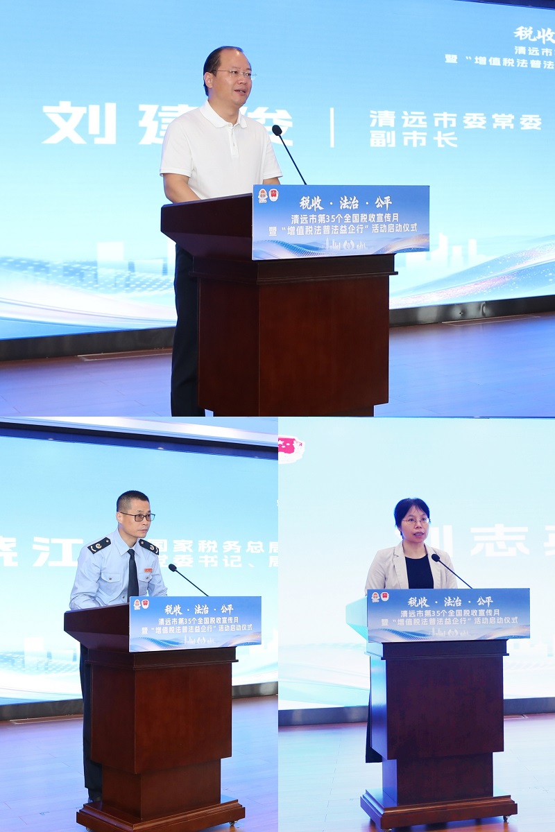 清远市委常委、副市长刘建俊代表市委、市政府向纳税人缴费人、社会各界以及税务工作者致谢,强调全市各级党政部门要与税务部门通力合作、同向发力,社会各界和新闻媒体要积极支持税收工作,加大税法宣传力度,共同营造依法诚信纳税的良好氛围,为清远高质量发展凝聚强大合力。