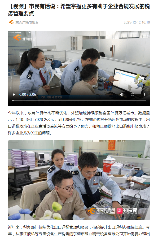 近年来,税务部门持续优化出口退税管理和服务,持续提升出口退税办理便捷度。今年,从事注液机等专用设备生产销售的东莞市超业精密设备有限公司开始需要办理出口退税。企业表示,出口退税均在线上“无纸化”申报,备案单证采取电子化管理,操作上较为便捷、更加高效,快速到账的退税款更好地保障了订单的生产和交付。而在日常涉税管理中,企业最为关注收汇管理方面的要求。