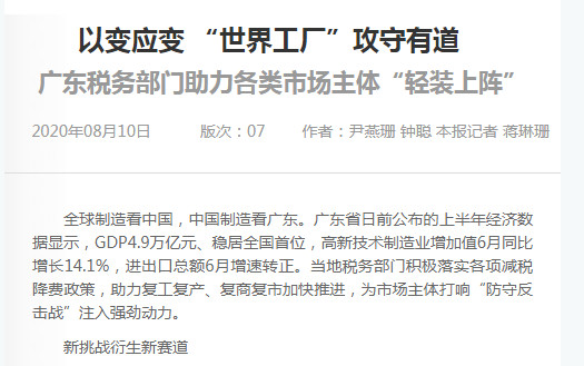 全球制造看中国,中国制造看广东。广东省日前公布的上半年经济数据显示,GDP4.9万亿元、稳居全国首位,高新技术制造业增加值6月同比增长14.1%,进出口总额6月增速转正。当地税务部门积极落实各项减税降费政策,助力复工复产、复商复市加快推进,为市场主体打响“防守反击战”注入强劲动力。