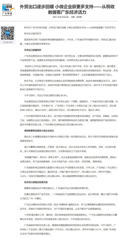 国家税务总局广东省税务局的最新数据显示,今年来,广东省经济形势稳中向好,外贸出口逐步回暖,小微企业获得更多政策支持。