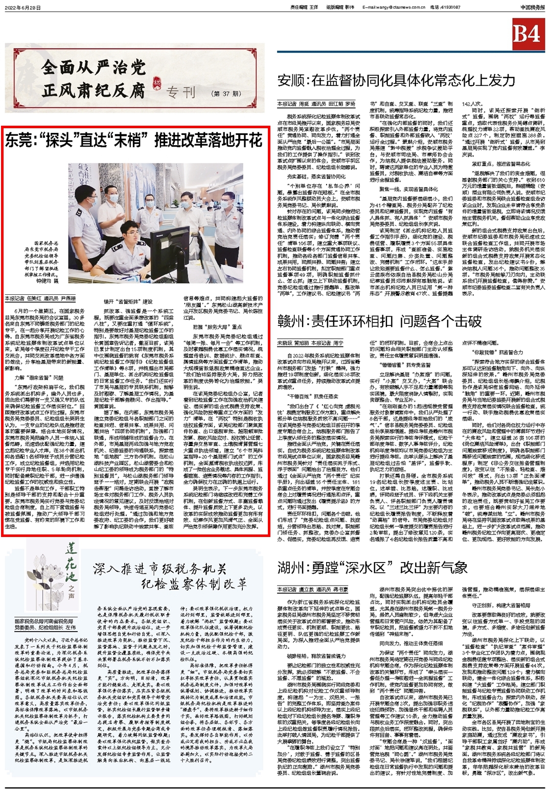 东莞市税务局党委纪检组通过“每周一报、每月一会”等工作机制,及时掌握税费优惠工作落实情况,梳理宣传培训、数据统计、疑点核查、舆情监测等方面监督工作清单,推动大规模留抵退税政策精准直达企业。“我们始终坚持服务大局,努力把改革的制度优势转化为治理效能。”吴明生说。