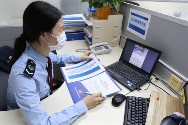 图为国家税务总局东莞市税务局税务人员运用“非接触式”方式辅导纳税人了解出口退税新政。