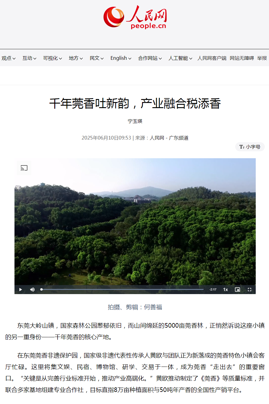 东莞市尚正堂莞香发展有限公司文旅部经理谢静兰:“2018年开始,大岭山莞香小镇就被列为第一批广东省级的特色小镇创建对象。在2023年,我们成功创建了依托园区莞香种植园基地以及良好的自然景观水库,大岭山镇串联起了莞香银行、沉香展览馆等。我们将文化旅游体验香料交易来一体打造大岭山特色的绿美乡村。”