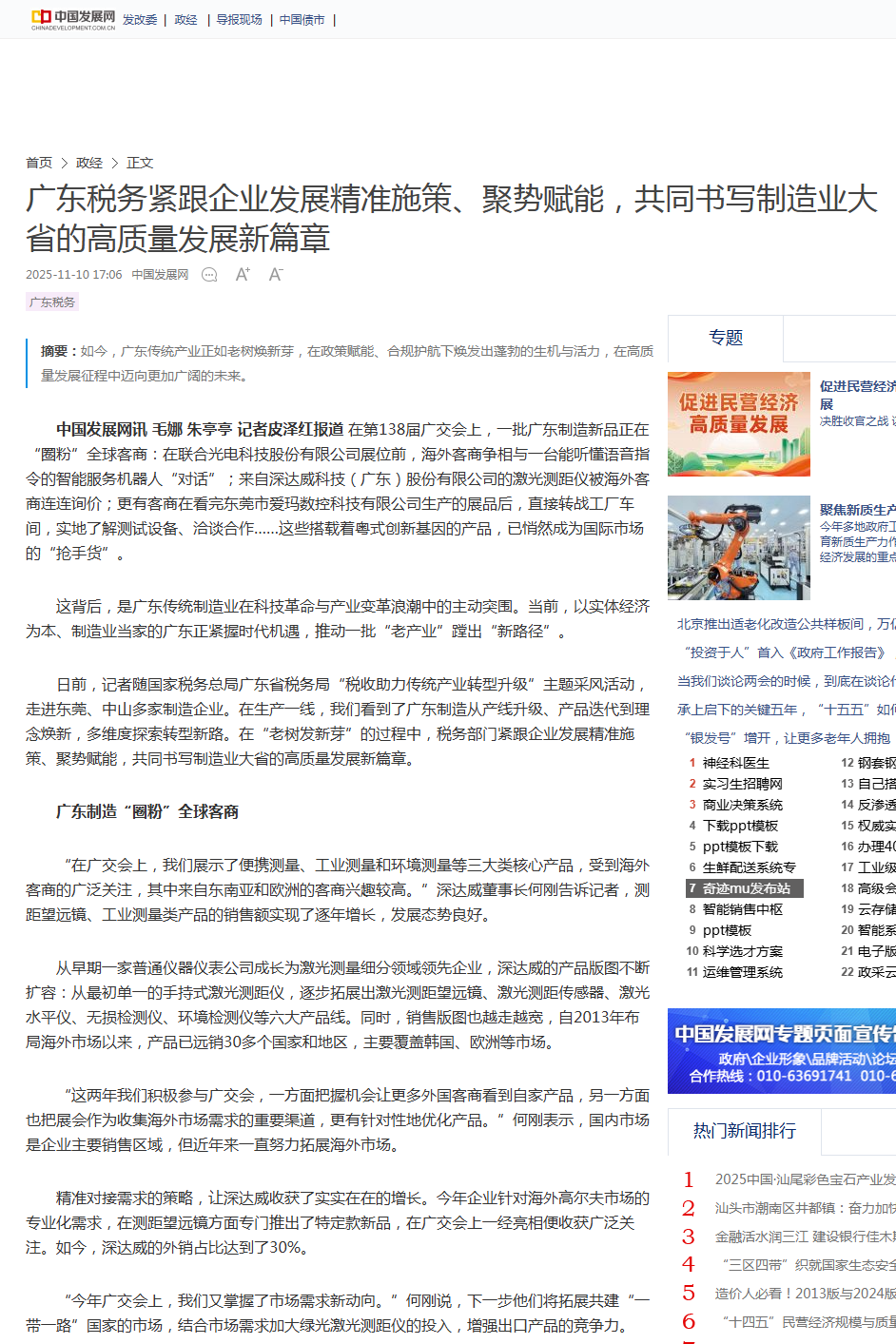 中国发展网讯 毛娜 朱亭亭 记者皮泽红报道 在第138届广交会上,一批广东制造新品正在“圈粉”全球客商:在联合光电科技股份有限公司展位前,海外客商争相与一台能听懂语音指令的智能服务机器人“对话”;来自深达威科技(广东)股份有限公司的激光测距仪被海外客商连连询价;更有客商在看完东莞市爱玛数控科技有限公司生产的展品后,直接转战工厂车间,实地了解测试设备、洽谈合作……这些搭载着粤式创新基因的产品,已悄然成为国际市场的“抢手货”。