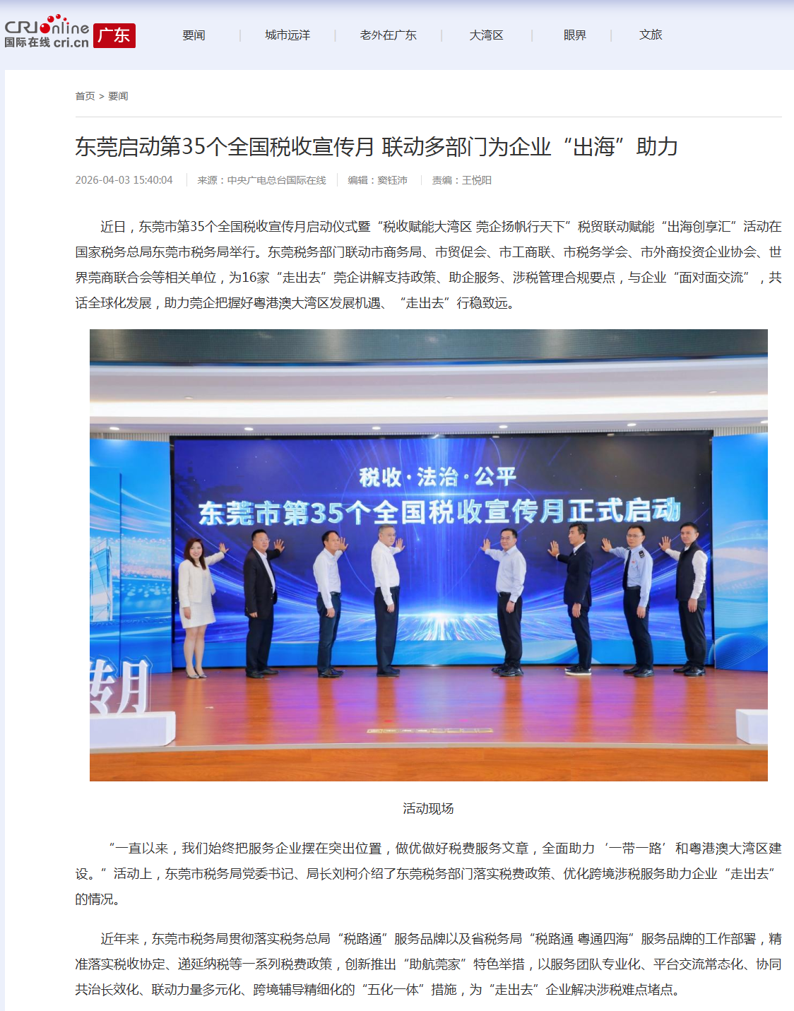 “一直以来,我们始终把服务企业摆在突出位置,做优做好税费服务文章,全面助力‘一带一路’和粤港澳大湾区建设。”活动上,东莞市税务局党委书记、局长刘柯介绍了东莞税务部门落实税费政策、优化跨境涉税服务助力企业“走出去”的情况。