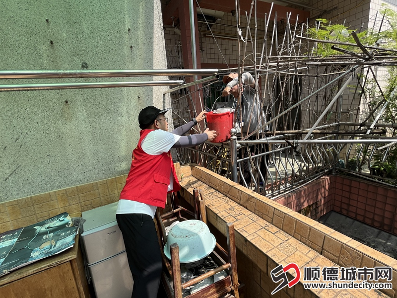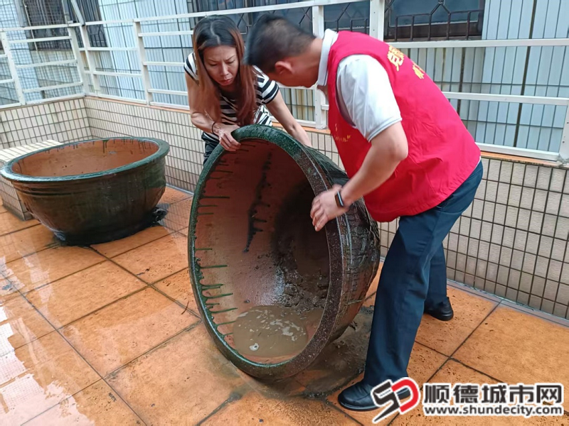 顺德税务党群先锋队队员正在进行入户质检工作,检查是否有阳性积水。