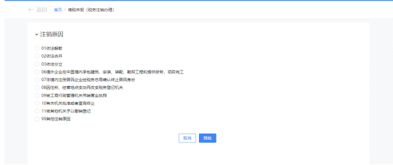登录全国统一规范的电子税务局(网址http://guangdong.chinatax.gov.cn):【我要办税】-【综合信息报告】-【状态信息报告】-【清税申报(税务注销办理)】,跳转至清税申报(税务注销办理)界面→展示注销原因→选择注销原因。