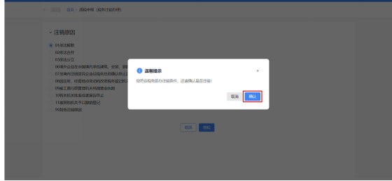 ②系统提示“尊敬的纳税人:您符合税务即办注销条件,确认是否注销!”,点击【确认】。