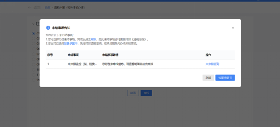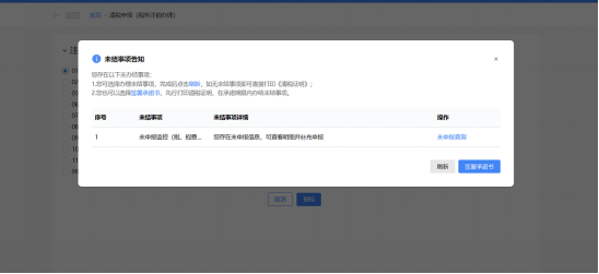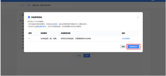 1)符合即办注销资格及条件,但存在未办结事项,且未办结事项存在非提示类事项时。弹出未结事项告知界面,系统提示“您存在以下未办结事项:您可选择办理未结事项,办理完结后点击刷新,继续进行清税申报。”,展示未结事项以及对应办理链接按钮。