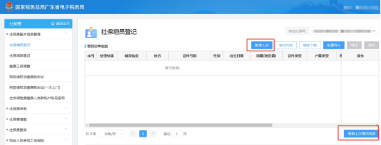 1.登录全国统一规范的电子税务局(网址http://guangdong.chinatax.gov.cn):【我要办税】→【社保费业务】→【社保网报】(或者在首页面中间位置的热门服务中点击【社保费业务】)→【社保费基本信息管理】→【社保增员登记】,选择实际参保年月(如新增人员数量较多的,可下载模板)等相关信息,并按照相关步骤操作即可。 |