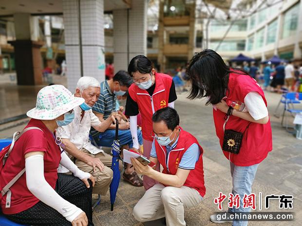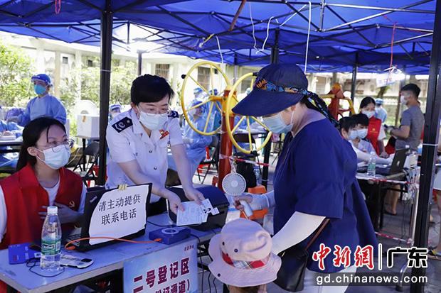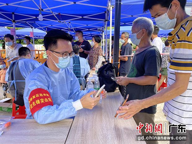 图为税务志愿者在佛山市南海区花苑社区一线协助开展核酸检测工作,耐心为老年群体进行信息登记。