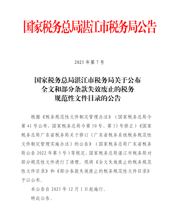 关于《国家税务总局湛江市税务局关于公布全文和部分条款失效废止的税务规范性文件目录的公告》的解读