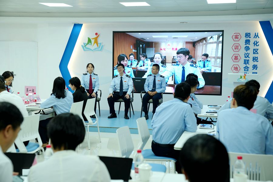 在广州市从化区税务局的“税费争议处置营地”内,一场模拟社保费征缴纠纷的处置演练正在紧张进行。在营地设置的联合处置室、模拟接访区里,青年干部们分别扮演纳税人、窗口人员、调解员等角色,在贴近真实的场景中提升涉税争议处置能力。