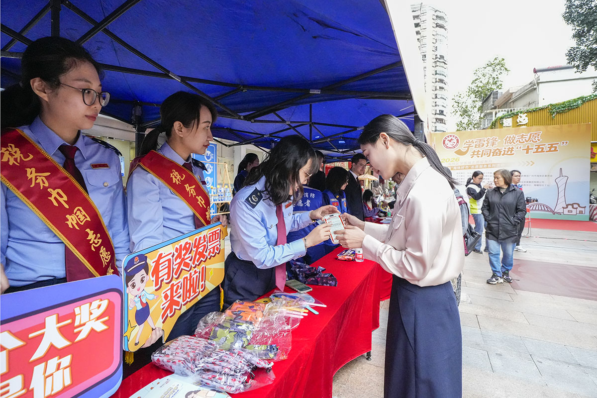 近日,海珠区税务局组织干部开展学雷锋志愿服务活动,在海幢街邻里志愿广场设置“税爱”宣传服务点,志愿者面向居民开展个税政策、有奖发票等民生税费知识宣讲,现场发放宣传资料、解答群众咨询,通过“税收知识问答”小游戏向社会大众普及税法知识。
