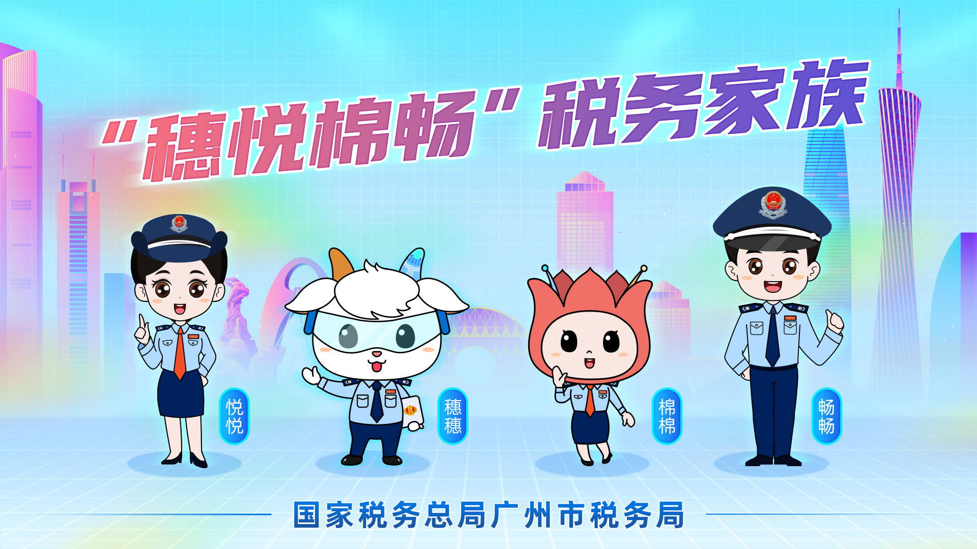 广州税务全新卡通形象组合以科技羊穗穗、木棉花精灵棉棉和两个税务人员畅畅、悦悦组成,综合税务元素、广州地域特色、形象本意等,取谐音“岁月绵长”的叠字组成,旨在表达税务人与纳税人缴费人勠力同心、携手共进,创造更优税收营商环境的美好愿景。