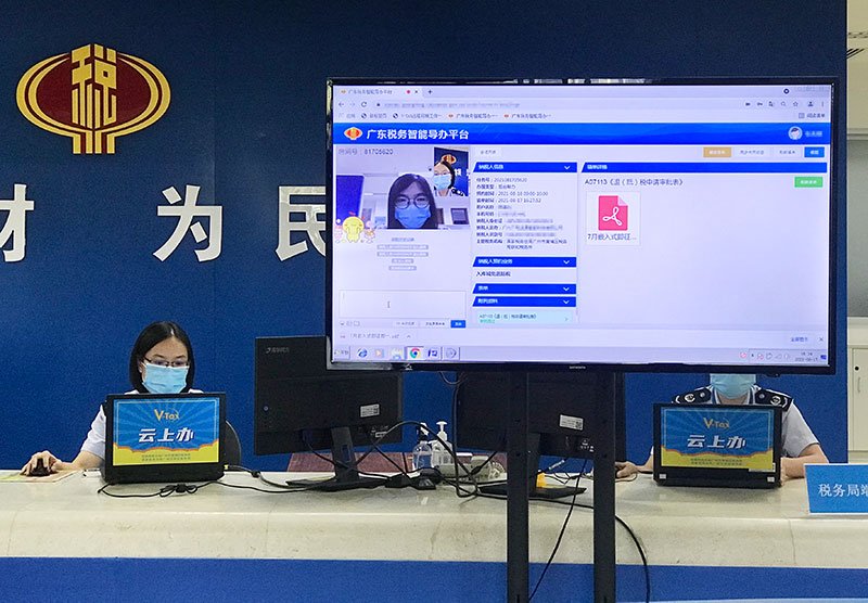 在位于黄埔区开创大道的全市首个可视化云税厅,记者看到,纳税人办理退税时,只需要进入V-Tax平台,智能导税、智能问答功能就会自动定位到退税业务;纳税人授权税务人员后台帮办,点击提交资料即可完成操作,办理结果自动推送;如果有问题,税务人员会使用视频或语音在线联系进行确认核实。整个流程简单、快捷,新手小白也能轻松享受“问、办、查、评、送”(即线上问答、远程帮办、进度查询、办结评价、消息推送)一体化全链条服务,真正实现了纳税人“一次都不用跑”。