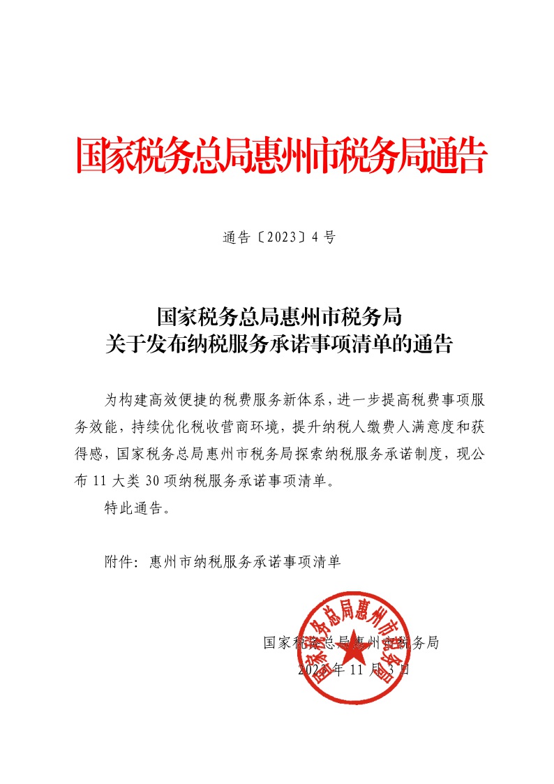 国家税务总局惠州市税务局关于发布纳税服务承诺事项清单的通告