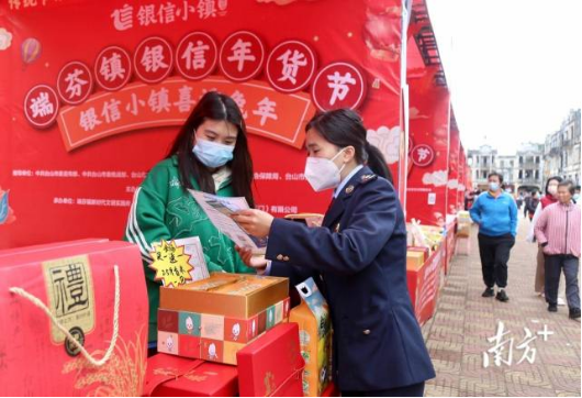 在著名电影《让子弹飞》的拍摄地——梅家大院,“端芬镇2023年银信年货节”梅家大院会场热闹非凡,31户各类厂家产品展销如火如荼,台山大米、烤鳗、生蚝和青蟹等4个国家农产品地理标志产品深受大家喜爱。“收款到账100元...”上一单支付成功的语音播报还没结束,下一单的播报紧接而来,现场一片热闹场景。