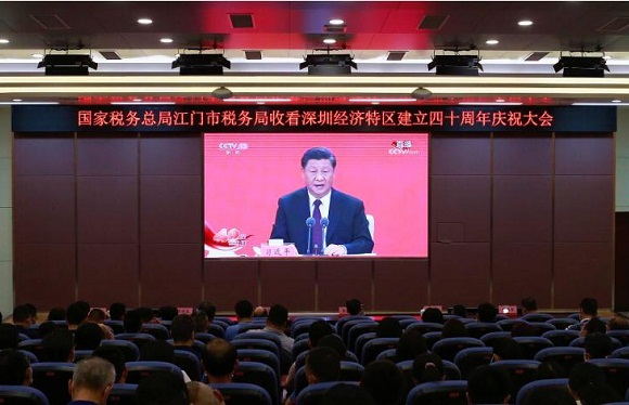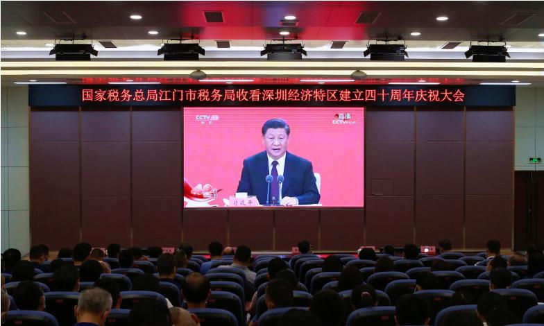 10月14日上午,深圳经济特区建立40周年庆祝大会在深圳市隆重举行。江门市全体税务干部群众通过电视、网络、新媒体平台等多种方式收听收看大会盛况,认真聆听习近平总书记在大会上作的重要讲话。