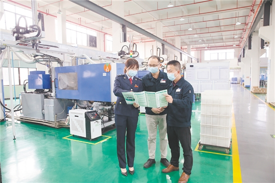 我市全力兑现大规模增值税留抵退税政策,及时提供现金流帮助企业缓解和应对生存发展困难。图为税务部门为企业送政策上门。