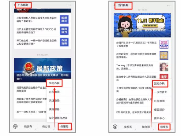 关注“广东税务”或“江门税务”微信公众号,在下方菜单栏选择“微服务”—“预约办税”—填写经办人相关信息—选择办税主体—选择所要预约的办税服务厅和业务类别、时间段进行预约。