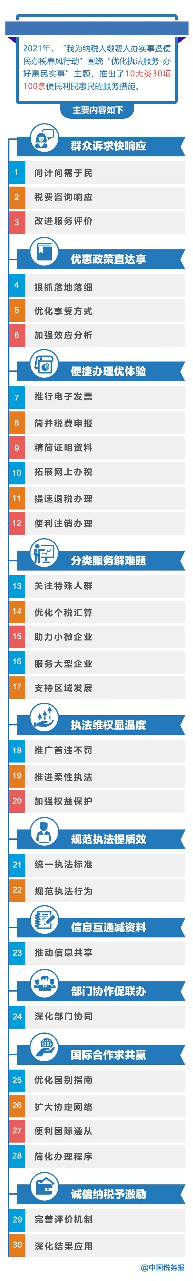 2021年“春风行动”有针对性地推出10大类30项100条具体措施,充分回应纳税人缴费人关切,例如:设立税费服务产品发布纳税人体验师机制;扩大税收优惠政策资料备案改备查范围;推广税务证明事项告知承诺制;优化个税汇算,开展“千人千面”提示提醒服务;推出全国统一的“首违不罚”清单;拓展“双随机、一公开”监管范围;推动汇总纳税企业企业所得税涉税信息跨省共享;推进社保缴费业务“一厅联办”;分批次更新发布50份国别(地区)投资税收指南;深化落实纳税信用修复机制。