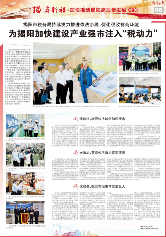 今年4月是第34个全国税收宣传月,活动期间,在市政府的大力支持下,市税务部门紧扣“税收·法治·公平”主题,联合市司法、财政、工商业联合会等部门举办税企政三方面对面座谈会,面向全市各行业协会代表、商会代表、涉税专业服务机构及企业负责人等近100人宣讲最新税费优惠政策和守信激励措施等内容,共同签署“合规经营·诚信纳税”倡议书。出席活动的市领导充分肯定了税务部门在服务地方经济发展中的积极作用,指出揭阳市税务系统扛牢主责主业,攻坚克难,在组织收入、深化改革、优化服务等方面取得了突出成绩,在服务大局中彰显了担当作为。并向广大市场主体、涉税中介机构发出号召,希望各类市场主体依法经营、诚信纳税,共同推动揭阳经济社会高质量发展。