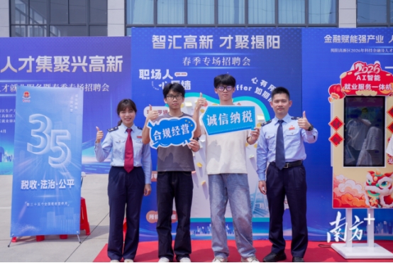 为精准对接揭阳高新区企业招才引智需求与高校毕业生就业创业诉求,近日,国家税务总局揭阳高新技术产业开发区税务局(以下简称“揭阳高新区税务局”)组织青年业务骨干,走进“揭阳高新区2026年科技金融及人才就业服务暨春季专场招聘会”现场,将精准化税费优惠政策与便捷化涉税服务送到企业和求职者身边。