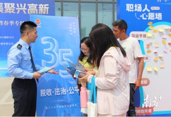 本次招聘会汇聚高新区优质企业与各地求职学子,是地区推动科技、金融、产业、人才深度融合的重要平台。活动现场人头攒动、气氛热烈,揭阳高新区税务局将政策咨询台“搬”到招聘一线,由业务骨干组成“税宣服务队”,为前来咨询的应届毕业生、求职群众及参展企业提供“面对面”的精准辅导,帮助就业群体迅速转换身份角色、增强依法纳税和诚信经营意识。