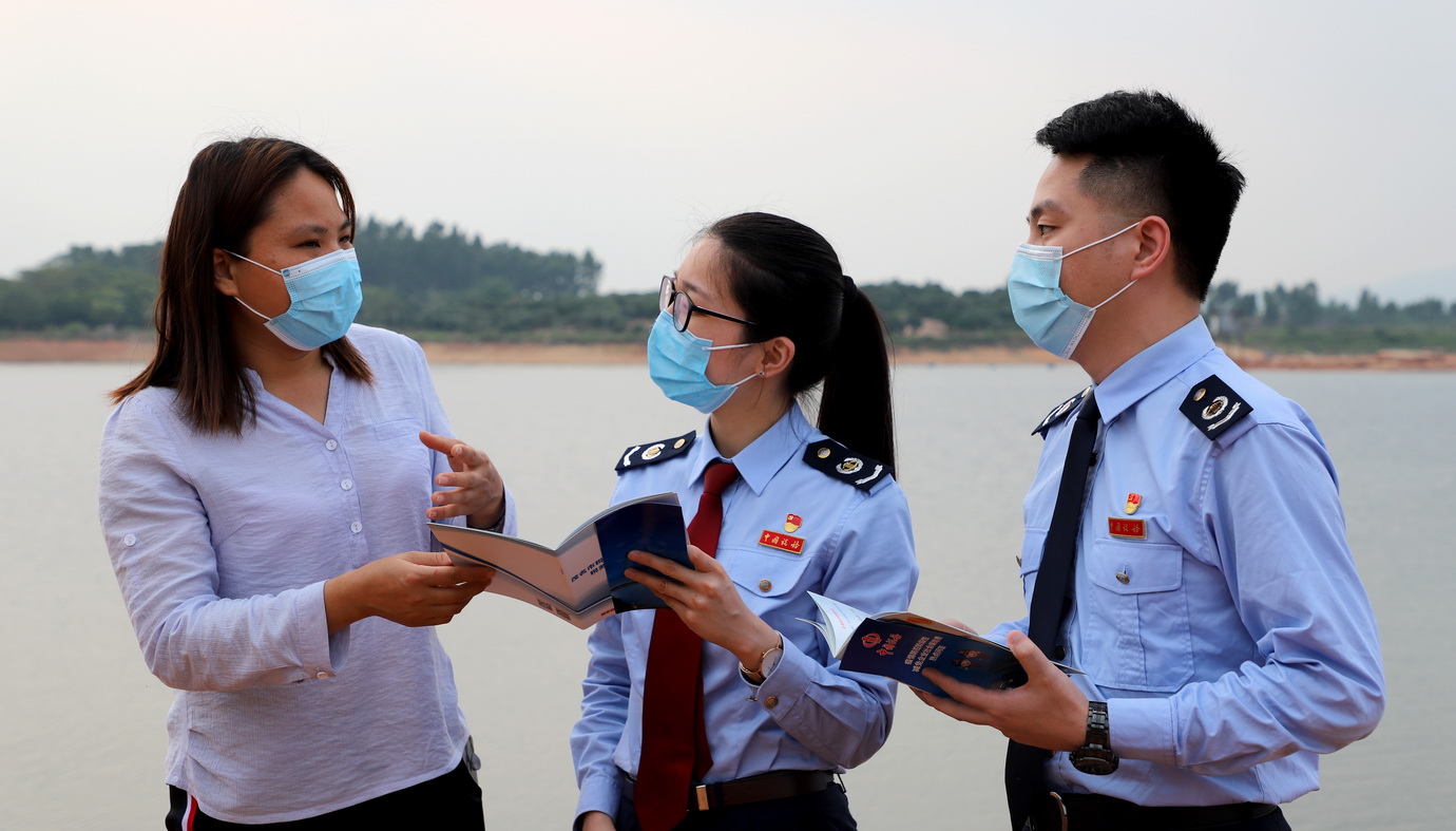 图为税务人员向罗非鱼养殖企业讲解惠农助农税费优惠政策。
