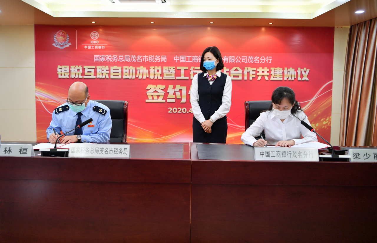 为深化办税缴费便利化改革,持续优化税收营商环境,助力银税协同发展,4月29日上午,国家税务总局茂名市税务局与中国工商银行茂名分行联合举办“银税互联”自助办税暨工行驿站合作共建签约仪式,由国家税务总局茂名市税务局党委委员、总会计师林桓与中国工商银行茂名分行副行长梁少丽现场签订合作共建协议,这标志着,银税互联自助办税、工行驿站合作共建、金融服务延伸等合作项目正式启动。