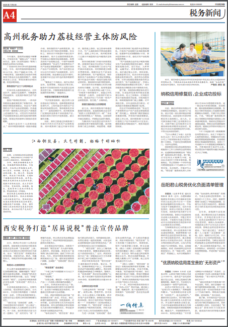 广东高州有2000多年的荔枝种植历史。今年,高州的荔枝种植面积达59.14万亩,预计产量超28万吨。在产销旺季里,国家税务总局高州市税务局干部走访全县荔枝种植户、收购商及加工企业,帮助其解决涉税问题、防范涉税风险。