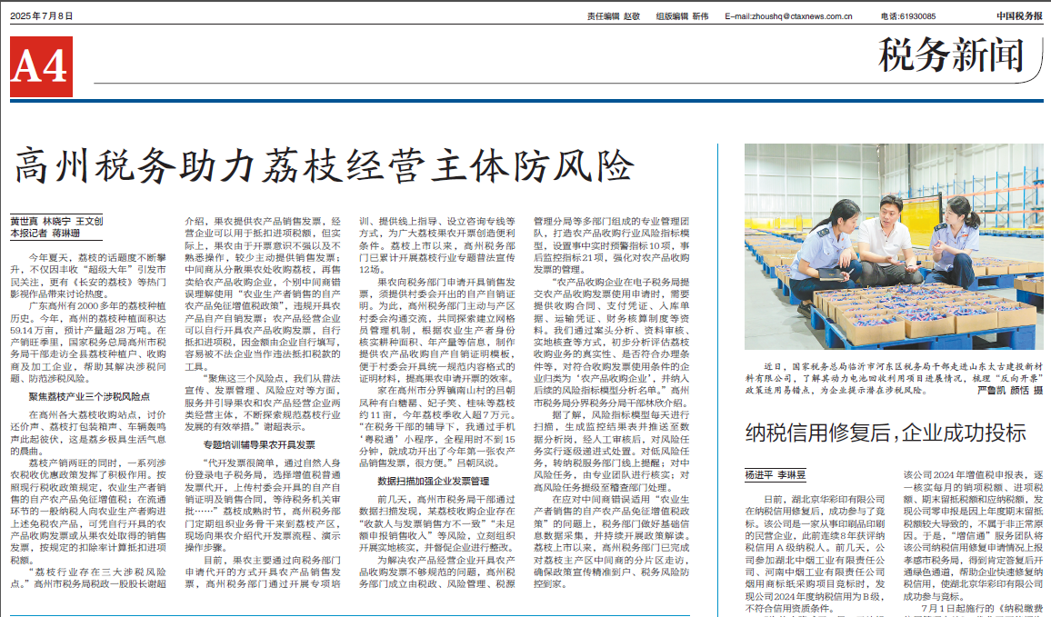 在应对中间商错误适用“农业生产者销售的自产农产品免征增值税政策”的问题上,税务部门做好基础信息数据采集,并持续开展政策解读。荔枝上市以来,高州税务部门已完成对荔枝主产区中间商的分片区走访,确保政策宣传精准到户、税务风险防控到家。