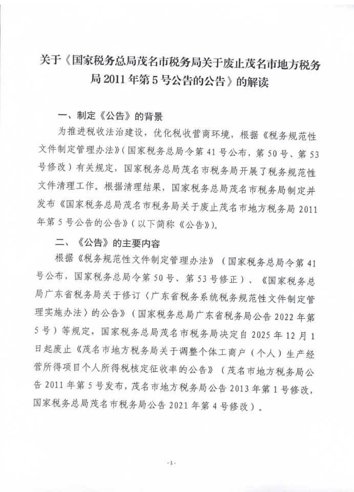 关于《国家税务总局茂名市税务局关于废止茂名市地方税务局2011年第5号公告的公告》的解读