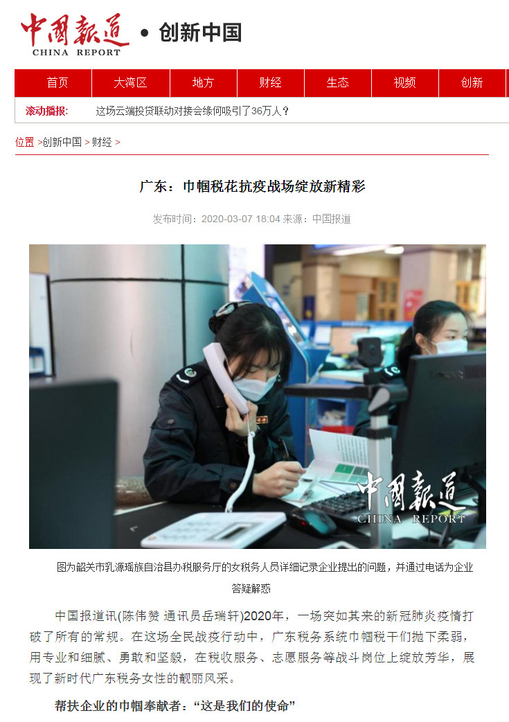中国报道讯(陈伟赞 通讯员岳瑞轩)2020年,一场突如其来的新冠肺炎疫情打破了所有的常规。在这场全民战疫行动中,广东税务系统巾帼税干们抛下柔弱,用专业和细腻、勇敢和坚毅,在税收服务、志愿服务等战斗岗位上绽放芳华,展现了新时代广东税务女性的靓丽风采。