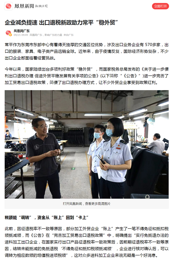 此外,记者从常平税务分局了解到,常平的出口退税办理近年来不断提速,从申报、审核、复审和核准等流程,全程实现了“无纸化”办理,退税流程不断优化,税务人员实时跟踪退税流转环节,保证退税办理不卡顿、不延时,申报无疑点的出口退(免)税业务的平均审核时间缩短在3个工作日以内。