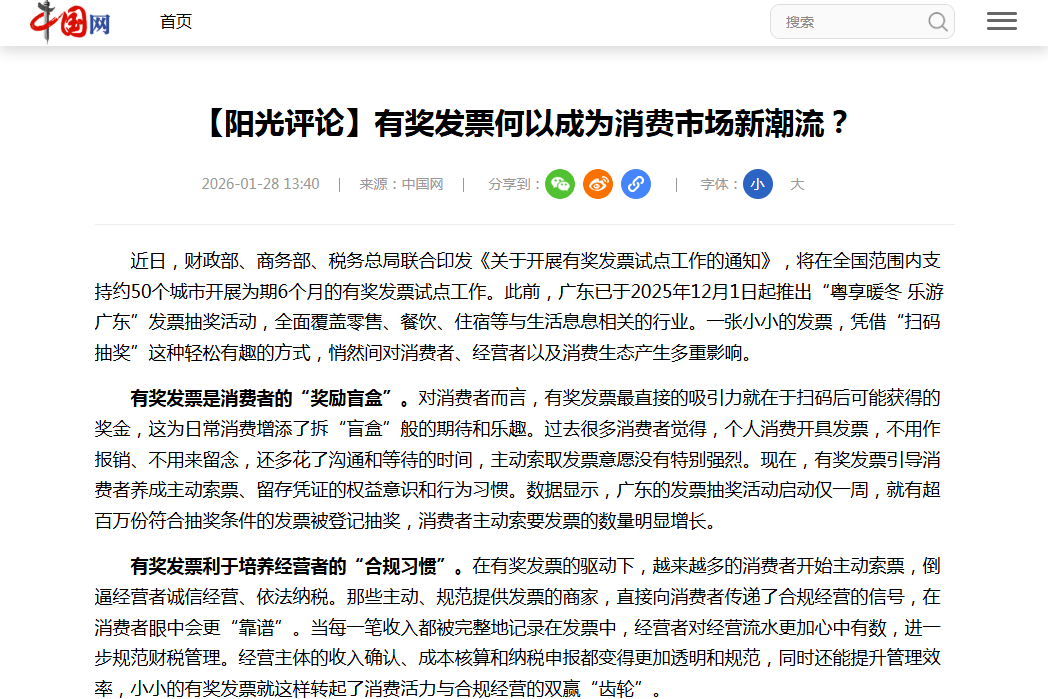 近日,财政部、商务部、税务总局联合印发《关于开展有奖发票试点工作的通知》,将在全国范围内支持约50个城市开展为期6个月的有奖发票试点工作。此前,广东已于2025年12月1日起推出“粤享暖冬 乐游广东”发票抽奖活动,全面覆盖零售、餐饮、住宿等与生活息息相关的行业。一张小小的发票,凭借“扫码抽奖”这种轻松有趣的方式,悄然间对消费者、经营者以及消费生态产生多重影响。