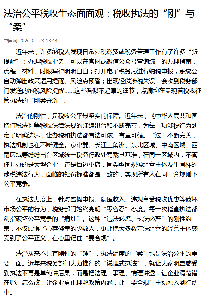法治从来不只有刚性的“硬”,执法温度的“柔”也是法治公平的重要一面。近年来税务部门大力推行的“说理式执法”,就让大家明显感受到执法不再是单纯讲后果,而是把法理、事理、情理讲透,让企业清楚错在哪、怎么改,让企业真正理解政策内涵,让“要合规”主动融入到行动中。