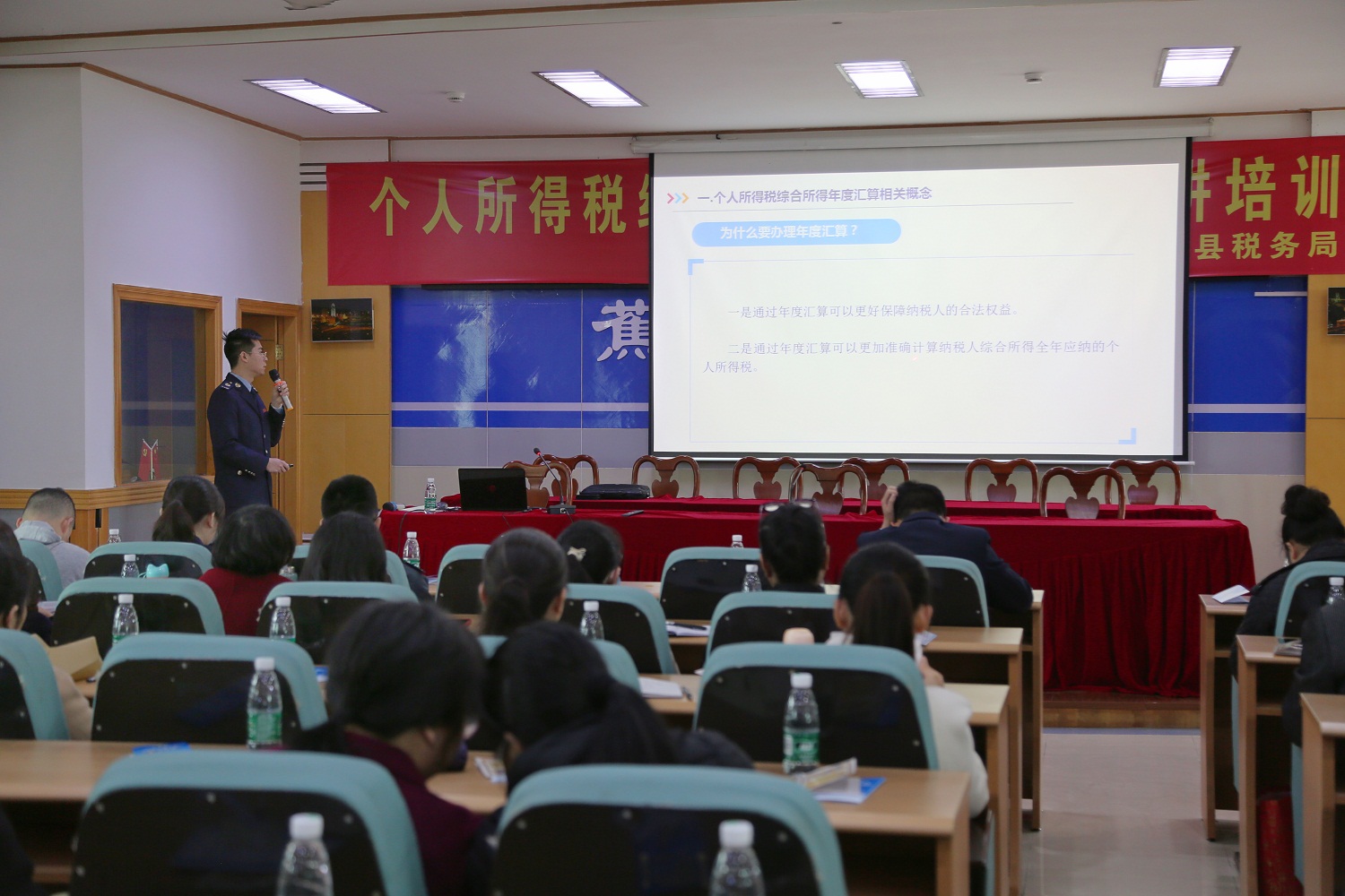 2023年度个人所得税综合所得汇算清缴于2024年3月1日正式启动。为规范个人所得税综合所得汇算清缴工作,切实帮助纳税人解决个税汇算申报、专项附加扣除填报等问题,近日,蕉岭县税务局举办“2023年度个人所得税综合所得汇算清缴宣讲培训会”,梅州市税务局个人所得税科副科长李平珍和蕉岭县税务局青年讲师张顺麟作为“个税汇算宣讲员”,针对教师、医生等群体集中的教育系统、卫生系统开展集中宣讲和个性化辅导。蕉岭县教育系统、卫生系统的财务人员、职工代表约120人参加了会议。