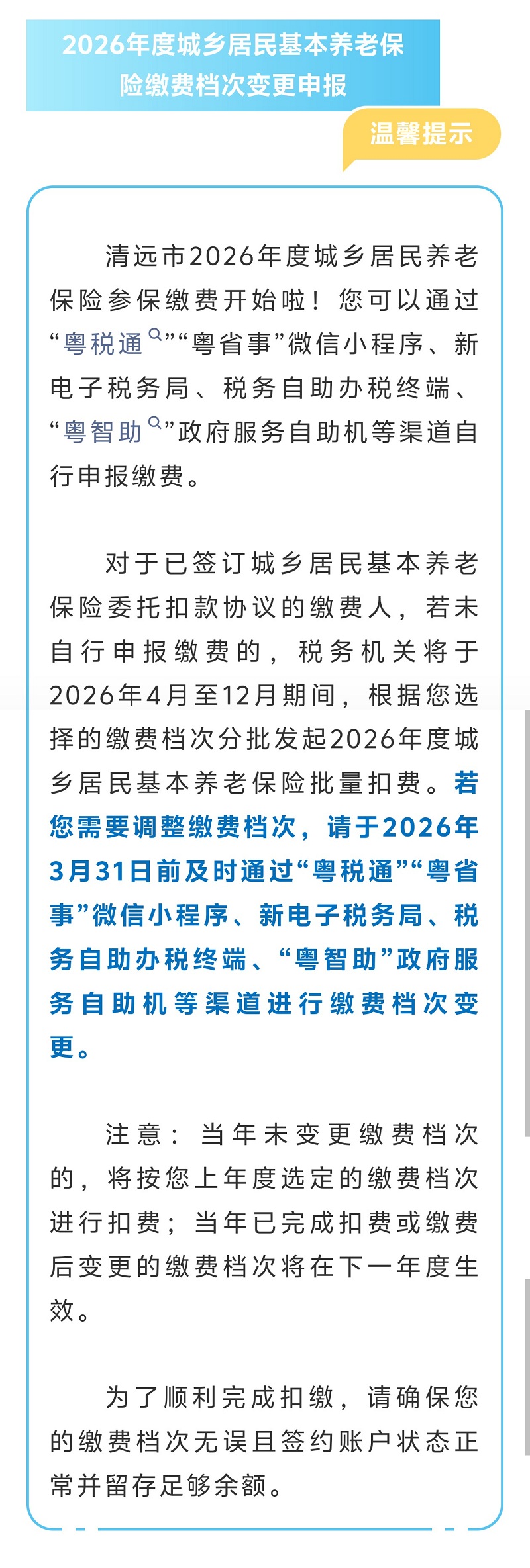 关于2026年度城乡居民基本养老保险缴费档次变更申报的温馨提醒