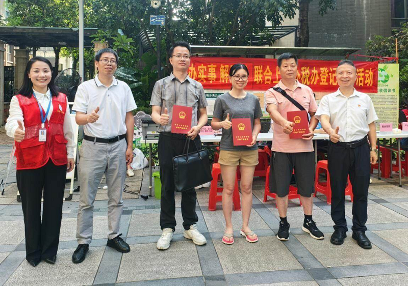 活动当天,联合志愿先锋服务队共发放宣传资料200余份,为23户符合即时办理条件的居民现场办理系列事项、联合颁发不动产权证书,实现“即办即出证”。“今天在家门口通过税务和政府部门的‘一条龙’服务解决了房产证办理问题,税也交了,证也拿了,太好了。”业主何焕平女士现场拿到了制作好的不动产权证,向联合志愿先锋服务队连声道谢,对此次税务和政府部门的“一站式”服务赞不绝口。