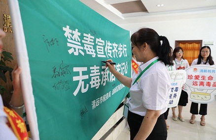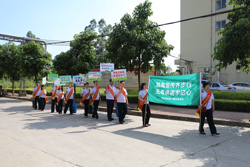 8月8日,国家税务总局清远市税务局与国家税务总局清新区税务局携手走进清新区太平镇龙湾工业园区开展“禁毒宣传齐步行无毒承诺牢记心”主题活动,10多名税务人员高举无毒宣传旗帜、手举禁毒宣传小牌子,列队走在工业园区的道路,呼吁工业园区的工作人员共同加入无毒园区的共建活动。