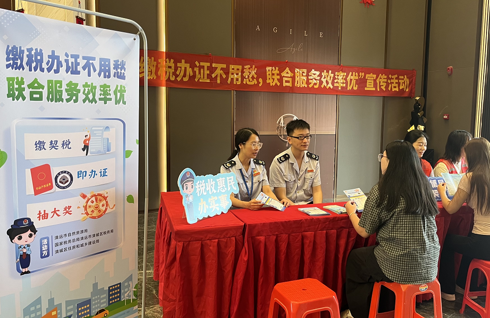 为进一步优化办事体验,切实解决群众“缴税办证”的难点、痛点问题,近日,清远市自然资源局、清城区税务局、清城区住房和城乡建设局联合组建服务队,走进住宅小区开展以“缴税办证不用愁,联合服务效率优”为主题的宣传活动,将“缴契税、即办证、抽大奖”的“一站式”服务送到群众家门口,推动“高效办成一件事”落地见效。