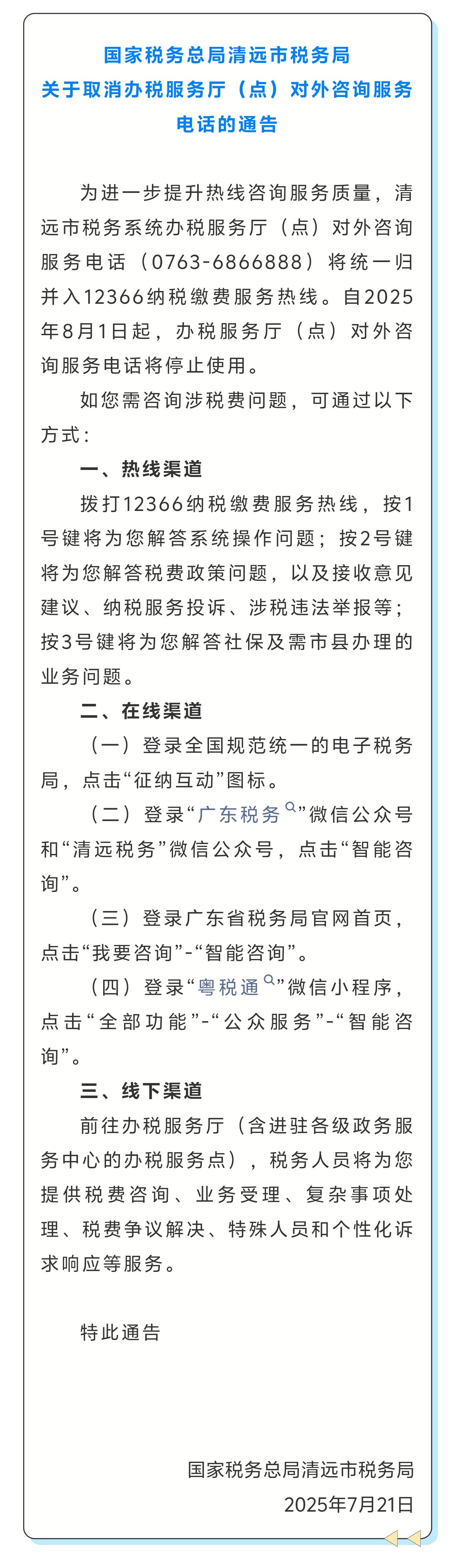 国家税务总局清远市税务局关于取消办税服务厅(点)对外咨询服务电话的通告