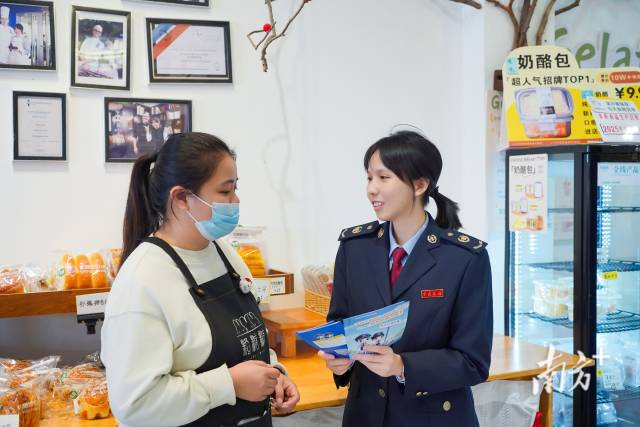税务人员走进沿街商户的粒糖糖蛋糕店讲解发票开具规范以及税收优惠政策的合规享受要点。