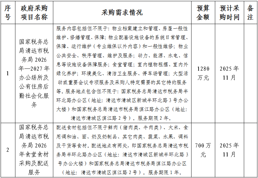 为便于供应商及时了解政府采购信息,根据《财政部关于开展政府采购意向公开工作的通知》(财库〔2020〕10号)等有关规定,现将国家税务总局清远市税务局2025年第四季度政府采购意向公开如下: