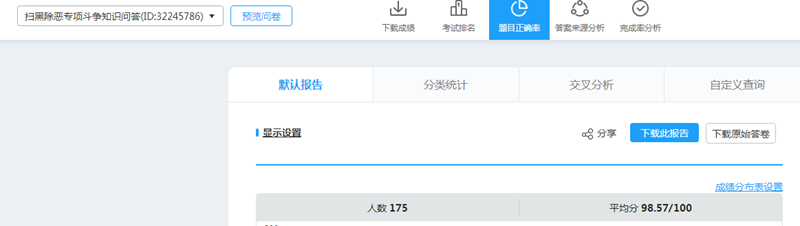 为了增强我局干部职工对扫黑除恶专项斗争的知晓度与参与度,提高工作的积极性和主动性,本周我局开展了“扫黑除恶知识学习与测试活动”活动,区局全体在编干部职工,业务前台派遣人员及购买服务人员参与了活动。活动采取网上学习和微信答题的方式进行。全局共有175人参加了扫黑除恶知识测试,平均分达到98.57。通过该活动提高全体干部职工的扫黑除恶知识,激发了全体人员参与扫黑除恶专项斗争的热情。