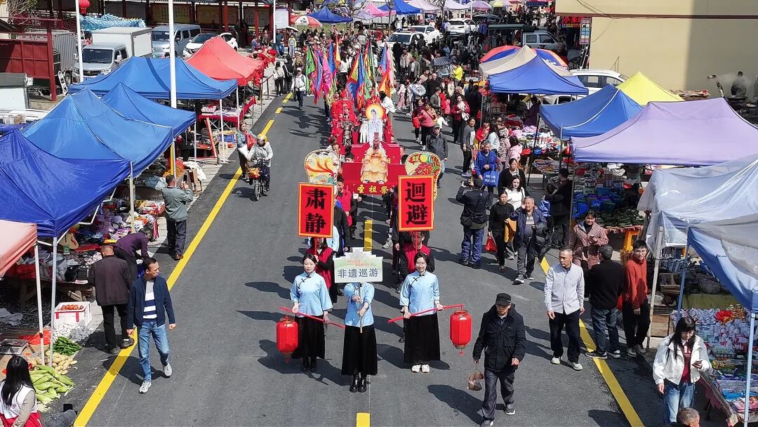 上午10时许,非遗大巡游正式开启。队伍从古道文化公园出发,沿大桥村委、长兴街、美丽示范主街等既定路线缓缓前行,舞龙狮仪仗队率先登场,紧随其后的,是承载着大桥镇非遗精髓的核心方阵——契娭塑像轿辇队、圣祖舜帝塑像轿辇队、阿公搓轿队。为增强互动性与体验感,沿线设置展演暂停点,沿途群众纷纷驻足观看,沉浸式感受非遗魅力。